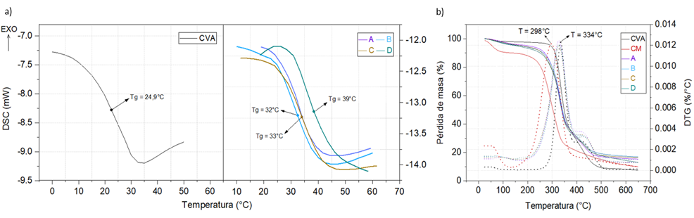 El análisis calorimétrico, mostrado en la Figura 3(a), reveló un incremento de aproximadamente 10 °C en la temperatura de transición vítrea (Tg) del CVA en los biocomposites. Este aumento podría atribuirse a la formación de interacciones tipo dipolo-dipolo entre la fibra y la matriz, lo que restringe la movilidad segmental del polímero y eleva su Tg. Estos resultados sugieren que, a pesar de la incompatibilidad entre los componentes, existen interacciones locales que afectan las propiedades térmicas del material (Rudnik, 2007). En el análisis termogravimétrico de la coronta de maíz (CM), copolímero vinil acrílico (CVA) y biocomposites, ilustrado en la Figura 3(b), se distinguen cuatro etapas de pérdida de masa.