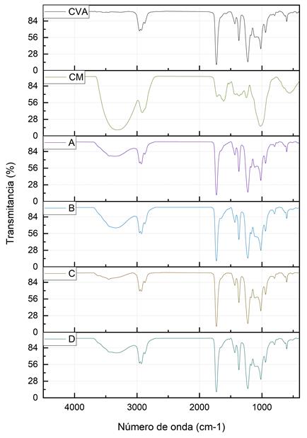 Los espectros del análisis infrarrojo, realizados tanto en la CM como en el CVA y los biocomposites, se presentan en la Figura 4. Para la CM, se observa la presencia de grupos hidroxilo (~3 000 y 1 627 cm-1), metilo (~2 958 y 2 872 cm-1), metileno (~2 925 y 2 856 cm-1), carbonilo (~1 727 cm-1), grupos acetal/cetal (enlace glucosídico ~1 173 y 1 018 cm-1), y grupos aromáticos (~1 660 - 1 450, 1 244, 667 cm-1). Estos grupos indican la presencia de agua, lignina, ácidos carboxílicos, hemicelulosa y celulosa, que son constituyentes característicos de la coronta de maíz (Zou et al., 2021).
