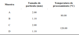 Este resultado se sustenta aún más en el análisis detallado de las interacciones entre estos factores, como se ilustra en la Figura 1(b). En dicha figura, se evidencia una interacción entre los factores de tamaño de partícula y temperatura de procesamiento en cada una de las propiedades estudiadas. Este patrón sugiere que el impacto de un factor en la respuesta está condicionado al nivel del otro factor, es decir, la relación entre las variables no es constante y la combinación específica de condiciones influye de manera significativa en los resultados observados. Finalmente, tras encontrar influencias significativas de los factores, se procedió a realizar la prueba de comparaciones múltiples Fisher LSD (Least Significant Difference) al 95 %, cuyos grupos homogéneos se detallan en la Tabla 6.