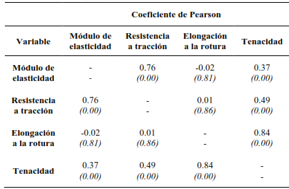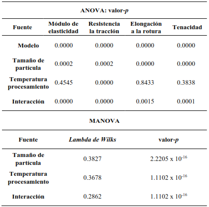 Como se observó en la evaluación previa de la correlación entre las variables dependientes mediante el coeficiente de Pearson, varias de estas variables están significativamente correlacionadas. No obstante, ningún valor de 𝑟 es mayor a 0.9, lo que indica la ausencia de multicolinealidad. Por otro lado, algunas variables, como el módulo de elasticidad y la elongación a la rotura, no presentan correlación significativa entre sí. En consecuencia, se optó por realizar el análisis de varianza con modelos lineales generales univariante (ANOVA) y multivariante (MANOVA), cuyos resultados se muestran en la Tabla 5.