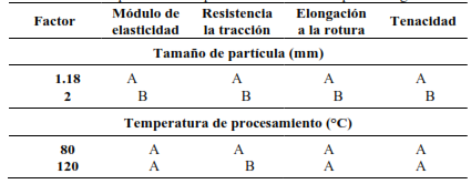Este análisis lleva a constatar que, en todas las variables, el tamaño de partícula surge como el factor más influyente. No obstante, es claro que la interacción de los refuerzos se vio afectada por el tamaño de partícula y la temperatura de procesamiento, conforme se evidenció en el análisis de varianza.