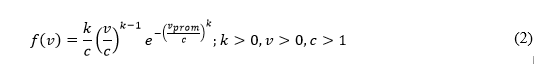 Donde k y c constituyen los parámetros forma y escala, respectivamente, y, la variable vprom representa la velocidad media o promedio del viento. El parámetro de forma k no tiene unidades y se puede obtener mediante la Ecuación (3).