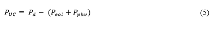 El despacho económico es utilizado para determinar la potencia activa en los generadores convencionales (Hyundai). Debido a la existencia de generadores eólicos y fotovoltaicos, la potencia para el despacho económico en las unidades convencionales PUC, se actualiza en cada paso de la simulación de Monte Carlo. La potencia PUC se calcula mediante la diferencia entre la demanda total del sistema Pd con la potencia de la central eólica Peol y de la planta fotovoltaica Pphv, tal como se detalla en la Ecuación (5).
