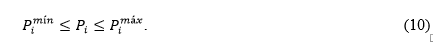 Los límites de generación se encuentran dados en la Ecuación (10), donde P i min y P i max representan las potencias de salida mínimos y máximos de cada unidad de generación.