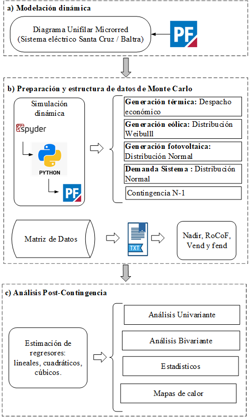 Los pasos ejecutados por el algoritmo son los siguientes: i) cálculo de la demanda del sistema mediante distribución normal; ii) asignación de niveles de potencia en generadores convencionales (Hyundai) mediante despacho económico; iii) asignación de niveles de potencia en generadores convencionales (aerogeneradores y planta fotovoltaica) mediante distribución Weibull; iv) contingencia N-1 mediante la desconexión aleatoria de generación; y, v) simulación dinámica en el dominio del tiempo en PowerFactory.