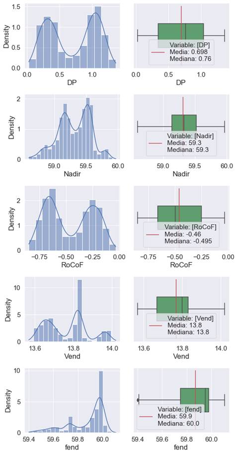 Como se puede observar en la Figura 2, no se identifican datos atípicos significativos en las distribuciones de las variables DP, NADIR, RoCoF, Vend, y fend Los diagramas de cajas confirman que la mayoría de los datos se encuentran dentro del rango intercuartil, con pocas observaciones fuera de este rango, lo que sugiere que la presencia de outliers es mínima.
