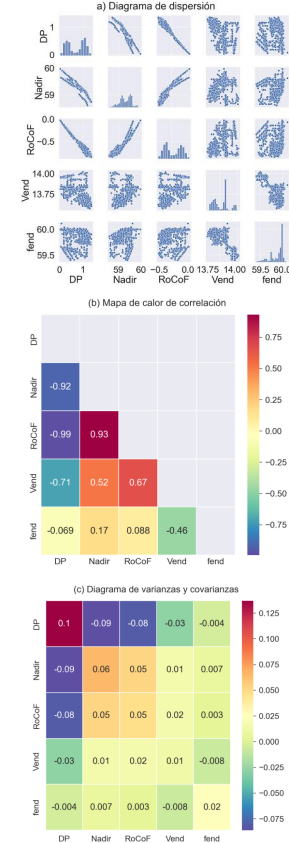 El análisis descriptivo bivariante se enfoca en explorar las relaciones entre pares de variables mediante herramientas gráficas y estadísticas. En la Figura 3 (a), se puede observar el diagrama de dispersión de las cinco variables en análisis, donde se puede resaltar que la potencia de salida 𝐷𝑃 tiene un comportamiento lineal con las variables 𝑁𝑎𝑑𝑖𝑟 y 𝑅𝑜𝐶𝑜𝐹.