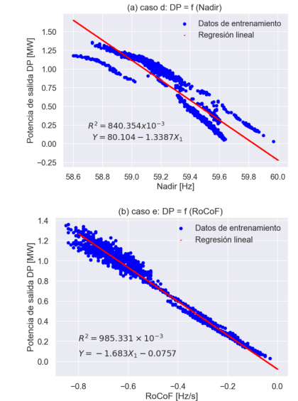 Como complemento, se desarrollaron dos modelos de regresión lineal simple para evaluar la relación individual de las variables NADIR y RoCoF, con la potencia de salida DP. El primer modelo, denominado caso d, estima DP en función de Nadir, como se muestra en la Figura 4(a). En este caso, R2 es 0,840, lo que indica que 𝑁𝑎𝑑𝑖𝑟 por sí sola no es un predictor fuerte de DP.
