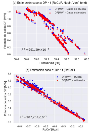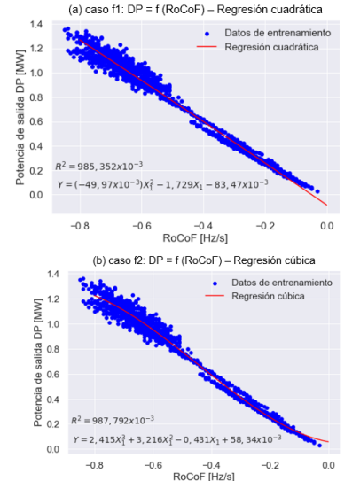 Modelo 1 (caso a): Incluye las variables NADIR, RoCoF, Vend, y fend. Este modelo mostró un R2 de 0,99226, e indica un alto grado de ajuste.