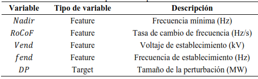 El modelo de regresión lineal múltiple se centra en establecer una relación cuantitativa entre la variable dependiente, el tamaño de la perturbación (DP), y las variables independientes NADIR, RoCoF, Vend y fend. Estas variables, al ser numéricas y continuas, favorecen la aplicación eficiente del modelo, cuyo objetivo principal es minimizar los errores al cuadrado mediante un ajuste óptimo de los coeficientes de regresión.