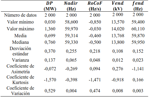 En cada simulación de Monte Carlo se ejecuta una simulación dinámica en el programa PowerFactory durante un tiempo de 20 segundos. Para cada simulación, se obtienen los datos de 𝑁𝑎𝑑𝑖𝑟 (Hz), 𝑅𝑜𝐶𝑜𝐹 (Hz/s), voltaje de establecimiento 𝑉𝑒𝑛𝑑 (kV) y frecuencia de establecimiento 𝑓𝑒𝑛𝑑 (Hz). Este proceso se repite para un número 𝑛 de simulaciones que varía dependiendo del número de iteraciones que se requiera, para este caso se consideraron 2 000 simulaciones. Los datos son almacenados en la matriz 𝑋 2 000 𝑥 4 que servirán para la estimación del regresor.