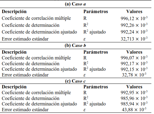 Tabla 3. Resultados del entrenamiento de la regresión lineal múltiple - (a) caso a: dependencia de 4 variables, (b) caso b: 3 variables, (c) caso c: 2 variables