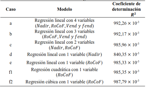 En la Tabla 4, se presenta un resumen de los casos de regresión que han sido objeto de estudio en esta investigación. Es evidente que el rendimiento más destacado se observa en el modelo de regresión lineal múltiple que emplea las cuatro variables independientes: 𝑁𝑎𝑑𝑖𝑟, 𝑅𝑜𝐶𝑜𝐹, 𝑉𝑒𝑛𝑑 y 𝑓𝑒𝑛𝑑. Por consiguiente, este modelo se utilizaría para la estimación de 𝐷𝑃, lo que, a su vez, facilitará la implementación de un EAC adaptativo.