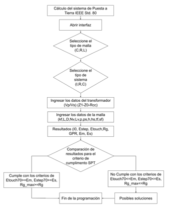 La metodología de programación se centra en la utilización de la biblioteca Tkinter de Python para la creación de una interfaz gráfica de usuario interactiva. Adicionalmente, se emplean bibliotecas complementarias, como ttk, tkinter messagebox, PySimpleGUI y PIL (Image, ImageTK), junto con funciones matemáticas y sqrt de Python para realizar cálculos numéricos. Un elemento crucial del programa reside en la integración de la función validar, responsable de validar las selecciones realizadas en las listas desplegables presentes en la interfaz. En función de la selección elegida, los valores correspondientes se transmiten posteriormente a segmentos específicos denominados "DATA_1", en los que los usuarios ingresan datos que incluyen voltajes, impedancias, resistencias, factores de corrección y las dimensiones de la malla. Los datos proporcionados se utilizan para el cálculo de las corrientes, las relaciones entre ellas, los diámetros de los conductores y la resistencia de la malla. Después de esto, la corriente máxima que fluye a través de la malla, el incremento del potencial del suelo (GPR) y el voltaje a través de la malla se determinan mediante la aplicación de ecuaciones y fórmulas específicas en la sección siguiente. Posteriormente, estos hallazgos se evalúan en función de los criterios establecidos, que abarcan el voltaje escalado y el voltaje táctil, para validar la adherencia. También se examina el cumplimiento del criterio para determinar la resistencia máxima de la malla. Si la resistencia calculada coincide o cae por debajo de la resistencia máxima predeterminada, se considera que se cumple el criterio; de lo contrario, se considera que no cumple.