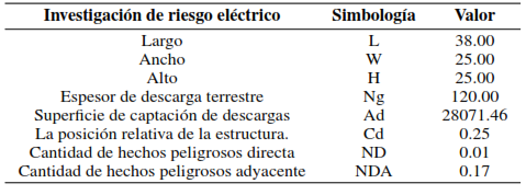 La Tabla delinea los componentes empleados para evaluar el riesgo dentro de un marco, teniendo en cuenta los factores ambientales y los atributos físicos, como la presencia anual de rayos, el tamaño de la estructura, los detalles relacionados con su protección y los datos sobre las medidas de protección externas. Esta investigación se ajustó a las directivas descritas en la norma IEC 52305-2.