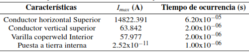 Los equivalentes eléctricos se construyen utilizando Atpdraw, mientras que el generador Heidler se emplea para replicar la descarga atmosférica, con una amplitud de 150000 A y un tiempo de onda completa de 1x10 −6 segundos. La información que se presenta en la Tabla 4 se utiliza para la configuración de los equivalentes eléctricos relacionados con los subsistemas de protección. Tras completar el circuito y ejecutar la simulación, se genera un archivo esencial denominado "Pl4", que requiere la conversión en matrices o vectores mediante el software PL42mat.