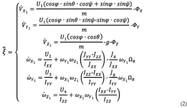 respectively. From works [14], [16] the system of differential equations describing the full dynamic model of a UAV type quadcopter (cross-shaped scheme) can be represented as follows (Eq. 2):