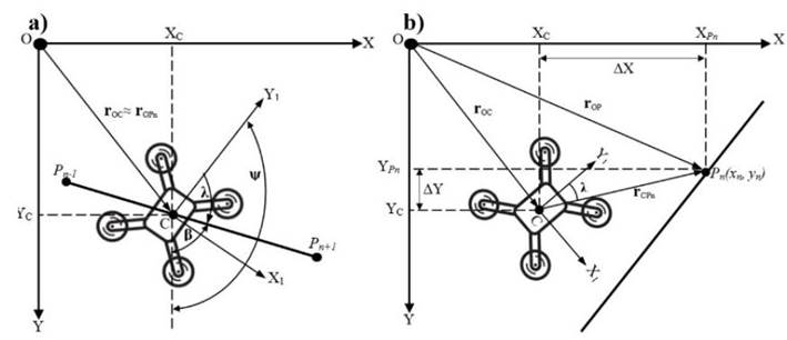As mentioned before, the presence of external disturbances significantly affects the dynamics of the UAV flight, which leads to motion deviations from the desired trajectory (figure 8b). In this regard, it is proposed to carry out the return of the aerial vehicle to the desired trajectory by turning the UAV at heading angle c, and then calculate the path deviation vector according to the equation (Eq. 20) [11], [16]:
