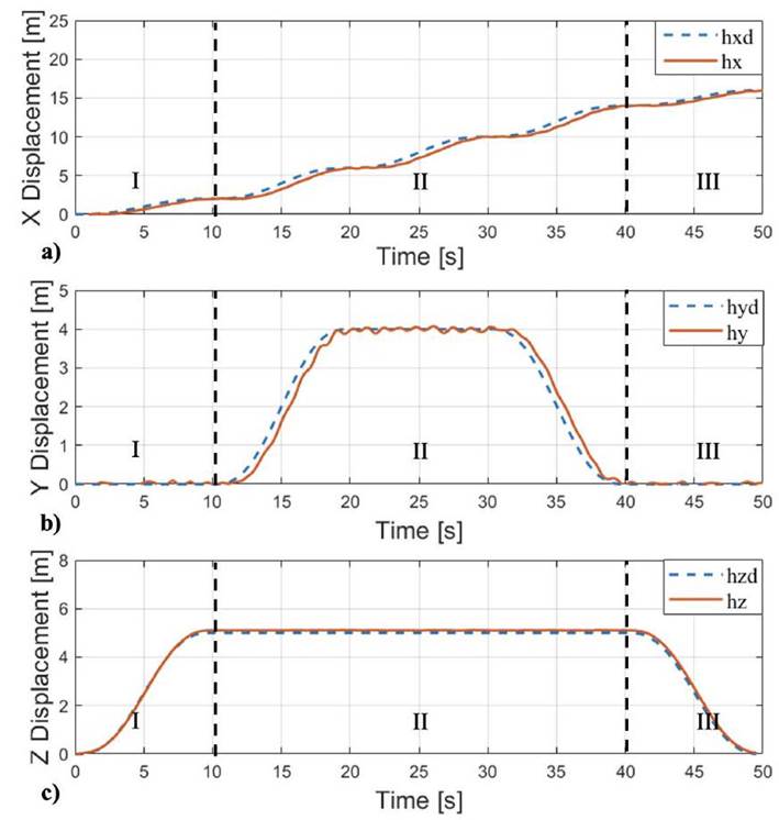 In this section are presented the main results of the simulation process carried out in MATLAB for the UAV autonomously controlled motion in presence of external disturbances along an open trajectory pattern in terms of stabilization and positioning accuracy properties. The parameters of the trajectory pattern considered in Table I correspond to the coordinates of the waypoints