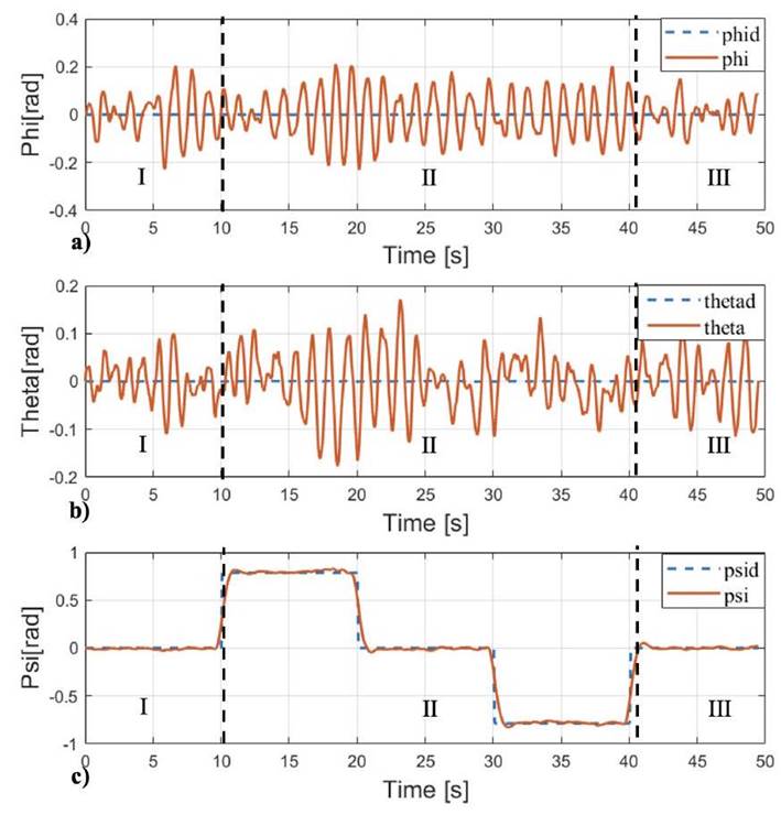 Fig. 10. Diagrams of the UAV center of mass deviation from the desired angular orientation: a, b, c - UAV deviation relative to OX, OY, OZ axes by aircraft angles j, q, y; I, II, III - take off, cruise flight and landing stages respectively