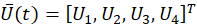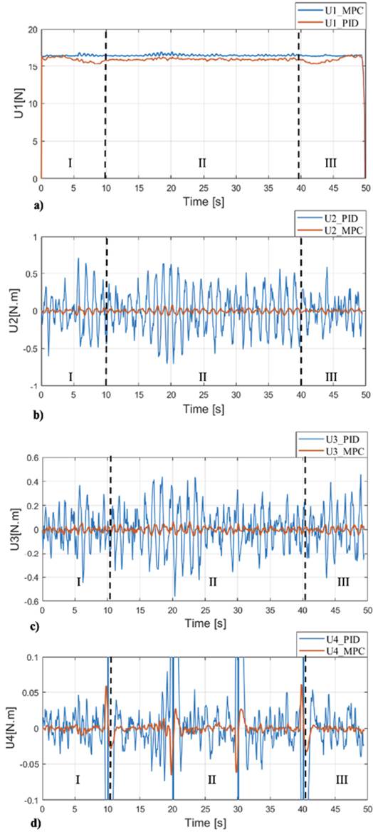 Fig. 12. Diagrams of the UAV controlled states: a, lift force U1; b,c,d - external moments U2,U3,U4 along OX, OY, OZ axes respectively.