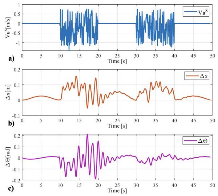 Fig. 13 Diagram of the variation in the deviation of the UAV center of mass along the X axis: a - Wind load distribution along the X axis; b -deviation of the UAV movement along the X axis; c -deviation of the UAV center of mass by the pitch angle θ.