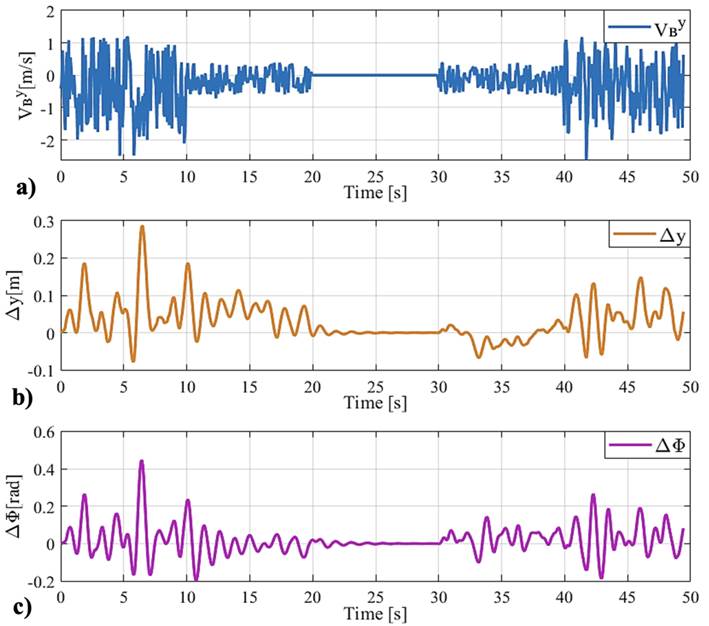 Fig. 14 Diagram of the variation in the deviation of the UAV center of mass along the Y axis: a - Wind load distribution along the Y axis; b -deviation of the UAV movement along the Y axis; c -deviation of the UAV center of mass by the roll angle φ