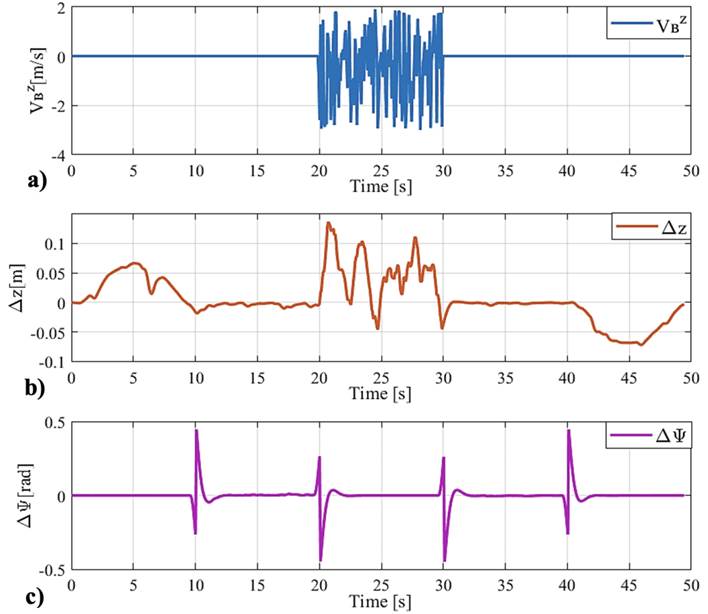 Fig. 15. Diagram of the variation in the deviation of the UAV center of mass along the Z axis: a - Wind load distribution along the Z axis; b -deviation of the UAV movement along the Z axis; c -deviation of the UAV center of mass by the yaw angle ψ.