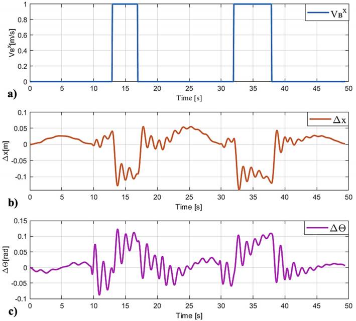 Fig. 16. Diagram of the variation in the deviation of the UAV center of mass along the X axis: a - wind load stepwise effect along X axis; b - deviation of the UAV movement along the X axis; c -deviation of the UAV center of mass by the pitch angle θ