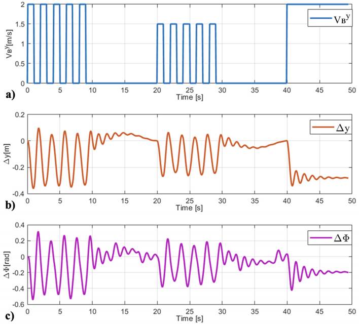 Fig. 17 Diagram of the variation in the deviation of the UAV center of mass along the Y axis: a - wind load stepwise effect along Y axis; b - deviation of the UAV movement along the Y axis; c -deviation of the UAV center of mass by the roll angle φ.