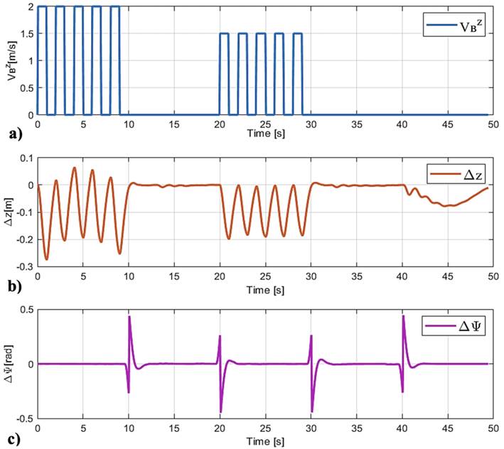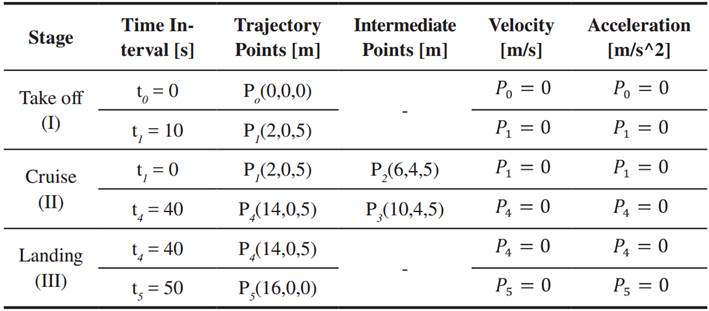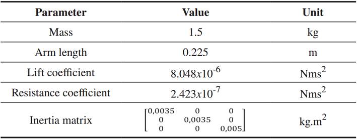 on each segment of the trajectory. In addition, the deviation vectors and control signals are determined at each iteration during the modeling process by integrating the differential equations of the UAV model, represented by the equation 11 using the Euler numerical integration method with a fixed step of 0.001 s. Besides, during the simulation process parameters, such as dimensional, mass-inertial and electromechanical main characteristics of the UAV are considered (Table II).