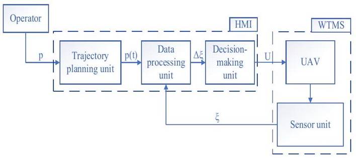 On the other hand, the UAV control system structurally can be presented as a set of the following modules: Operator, Human-Machine Interface (HMI) and UAV (figure 3). In turn, HMI includes the blocks of trajectory planning, data processing and decision-making.