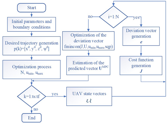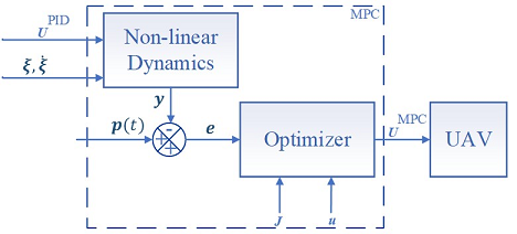 The mathematical significance of the MPC control algorithm synthesis belongs to form a vector of predictive output signals of the UAV for a certain number of iterations ahead within a given prediction horizon based on the ideal dynamic model of the UAV (Eq. 15) [19], [23].