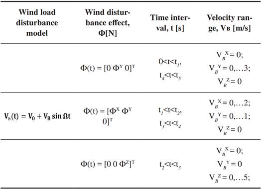 In contrast, wind loads of a deterministic nature (wind shear) often occurs in a relative short time and represent a strong atmospheric disturbance. In this study, the wind shear model is presented by short equation 8 and jump-like equation 9 pulse signals, including a periodic pulse signal in equation 10 modeled by the Fourier series decomposition method [14], [25].