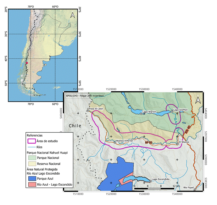 El valle del río Manso (mapa 1) se ubica a unos 70 km al sur de Bariloche. lo recorre una ruta de montaña (RP83) a la que se accede desde la ruta nacional 40 y bordea, de este a oeste por 40 km, el río hasta el límite con Chile. Este río divide el valle en dos jurisdicciones de diferente gestión: 1) la margen sur marca el límite austral del Parque Nacional Nahuel Huapi (PNNH), que corresponde a la Administración de Parques Nacionales (APN, cauce del río Manso incluido). Hacia el sur de la costa del río es jurisdicción de la provincia de Río Negro, sin figura legal de protección. Para ingresar al parque se debe cruzar el río desde el lado provincial, ya sea en algún tipo de bote o por alguna de las tres pasarelas sobre la ruta: a 11 km de la ruta 40 (pasarela “Andrade”), a 22 km (pasarela “Bayer”) y a 33 km (pasarela “John”).