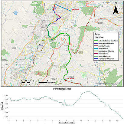 El ciclo de conducción utilizado en este estudio se basó en la ruta desarrollada por Pisuña y Solís [36], con una longitud total de 15 673 metros, que comprende 7993 metros de carretera suburbana y 7680 metros de segmentos urbanos. La Figura 1 muestra la ruta seleccionada para las pruebas de emisiones a bordo, diseñada para evaluar el desempeño del vehículo en relación con la altitud y las emisiones contaminantes. La elevación promedio a lo largo de la ruta es de 2610 metros sobre el nivel del mar [37].
