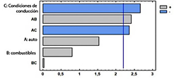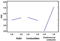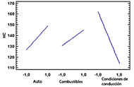 El diagrama de Pareto de la Figura9 muestra la influencia de los factores en las emisiones de HC, donde las condiciones de conducción y la interacción del tipo de automóvil con el tipo de combustible y las condiciones de conducción son los más relevantes. En la Figura 10 se muestran por separado los efectos de cada una de las variables sobre el efecto evaluado.