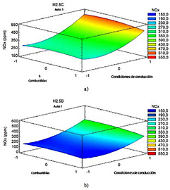 Figura 11 Emisiones de NOx en función del tipo de combustible y las condiciones de conducción para el vehículo M2.5C (a) y el vehículo H2.5B (b).