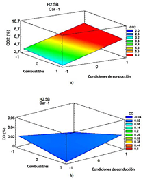Figura 2 Emisiones de CO2 (a) y emisiones de CO (b) del vehículo H2.5B en función del tipo