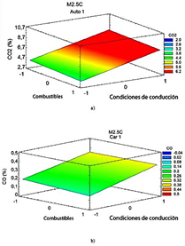 Figura 3 Emisiones de CO2 (a) y emisiones de CO (b) del vehículo M 2.5C en función del tipo de combustible y las condiciones de conducción.