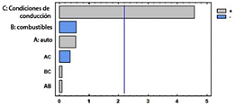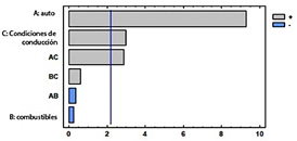 El diagrama de Pareto presentado en la Figura 4 muestra la influencia relativa de los factores experimentales sobre las emisiones de CO2 . El diagrama incluye los efectos principales y las interacciones de dos factores: AC (Vehículo-Condición de conducción), BC (Combustible-Condición de conducción) y AB (Vehículo-Combustible). Entre estos, las condiciones de