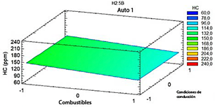 Figura 7 Comportamiento de las emisiones de HC en el vehículo H2.5B en relación con el combustible y las condiciones de conducción.