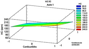 Figura 8 Comportamiento de las emisiones de HC en el vehículo M2.5C en relación con el combustible y las condiciones de conducción.