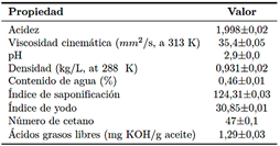 Tabla 1 Propiedades fisicoquímicas del aceite de cocina usado