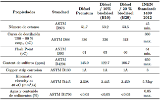 Tabla 2 Caracterización fisicoquímica de las mezclas de diésel y biodiésel