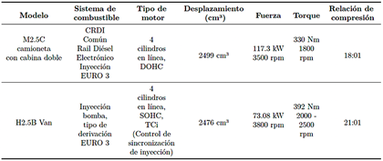 La Tabla 3 presenta las especificaciones técnicas de los dos vehículos de prueba utilizados en este estudio. El primer vehículo, una furgoneta MB-5 año modelo 2015, registraba un kilometraje de 55 000 km. El segundo vehículo, una furgoneta H2.5 también del 2015, había acumulado 143 365 km. Aunque la H2.5 está equipada con un sistema de inyección más antiguo, fue incluida en el estudio debido a su continua presencia en el mercado de vehículos usados en Ecuador. Además, este tipo de motor sigue siendo utilizado en aplicaciones de alta demanda, como camiones, locomotoras y embarcaciones marítimas, donde la durabilidad y la simplicidad mecánica son características clave.