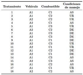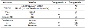Se implementó un diseño factorial multinivel para evaluar diversas mezclas de combustible (diésel, B10 y B20) en dos vehículos con tecnologías de inyección distintas: inyección directa common rail (CRDI) y sistema de bomba de inyección mecánica. Cada vehículo fue probado bajo tres condiciones de conducción: ascenso, urbano y descenso, generando múltiples combinaciones experimentales para la evaluación de emisiones de monóxido de carbono (CO), hidrocarburos (HC), óxidos de nitrógeno (NOx), así como las concentraciones de oxígeno (O2) y dióxido de carbono (CO2).