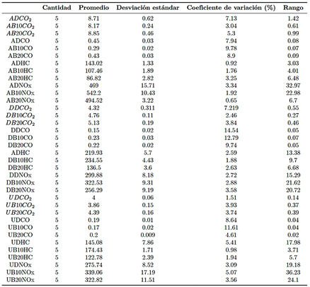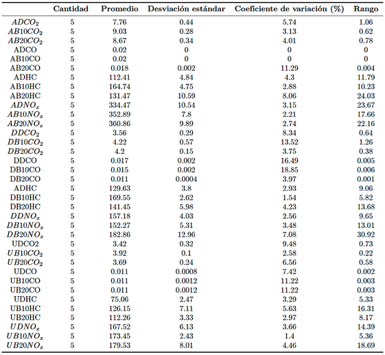 Nota: ADCO2 (ascenso diésel CO2 (%)), AB10CO2 (ascenso B10 CO2 (%)), AB20CO2 (ascenso B20 CO2 (%)), ADCO (ascenso diésel CO (%)), AB10CO (ascenso B10 CO (%)), AB20CO (ascenso B20 CO (%)), ADHC (ascenso diésel HC (ppm)), AB10HC (Ascenso B10 HC (ppm)), AB20HC (Ascenso B20 HC (ppm)), ADNOx (Ascenso diésel NOx (ppm)), AB10NOx (Ascenso B10 NOx (ppm)), AB20NOx (Ascenso B20 Nox (ppm)), DDCO2 (Descenso Diésel CO2 (%)), DB10CO2 (Descenso B10 CO2 (%)), DB20CO2 (Descenso B20 CO2 (%)), DDCO (Descenso Diésel CO (%)), DB10CO (Descenso B10 CO (%)), DB20CO (Descenso B20 CO (%)), DDHC (Descenso Diésel HC (ppm)), DB10HC (Descenso B10 HC (ppm)), DB20HC (Descenso B20 HC (ppm)), DDNOx (Descenso Diésel NOx (ppm)), DB10NOx (Descenso B10 NOx (ppm)), DB20NOx (Descenso B20 NOx (ppm)), UDCO2 (Urbano Diésel CO2 (%)), UB10CO2 (Urbano B10 CO2(%)), UB20CO2 (Urbano B20 CO2(%)), UDCO (Urbano Diésel CO (%)), UB10CO (Urbano B10 CO (%)), UB20CO (Urbano B20 CO (%)), UDHC (Urbano Diésel HC (ppm)), UB10HC (Urbano B10 HC (ppm)), UB20HC (Urbano B20 HC (ppm)), UDNOx (Urbano Diésel NOx (ppm)), UB10NOx (Urbano B10 NOx (ppm)), UB20NOx (Urbano B20 NOx (ppm)).