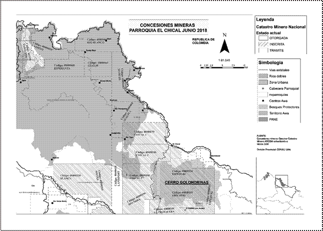 Un análisis, a partir del catastro minero disponible en el sitio web de la Agencia de Regulación y Control Minero (ARCOM), permite visualizar que para la parroquia El Chical, las concesiones otorgadas y en trámite cubren áreas de cabeceras de cuencas hidrográficas, zonas de recarga hídrica, bosques protectores, zonas de producción agrícola y centros poblados donde las “territorialidades"7 existentes entrarían en posible contradicción con las actividades mineras que se quiere emprender allí.
