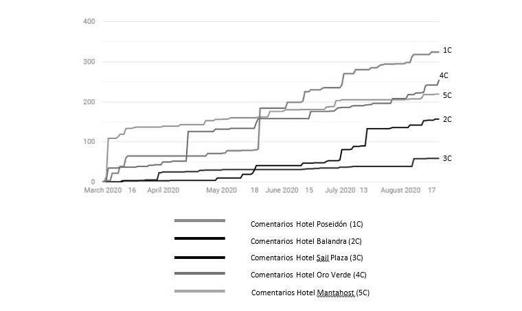 En el análisis de la variable generación (Figura 3), se observa que cada uno de los hoteles tuvieron diferentes períodos para ejercer la presión hacia sus seguidores en la realización de comentarios de sus publicaciones, de los cuales, el hotel Poseidón fue el último en reaccionar (21 de mayo) a diferencia de los hoteles como el Wyndham Sail Plaza (29 de marzo) y Oro Verde (14 de abril). El hotel Balandra presenta una reacción leve a partir de los primeros días de mayo, con un crecimiento más intencional en los primeros días de julio. Finalmente, el hotel Mantahost a diferencia del resto de hoteles evidencia un crecimiento lento, aunque constante en la generación de comentarios de sus seguidores durante el período de la emergencia.